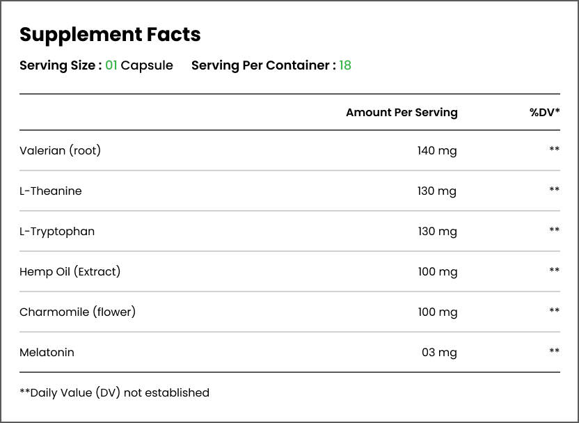 - Valerian, Chamomile, L-Theanine, and L-Tryptophan support mind-body relaxation and enhance GABA for deep restorative sleep.